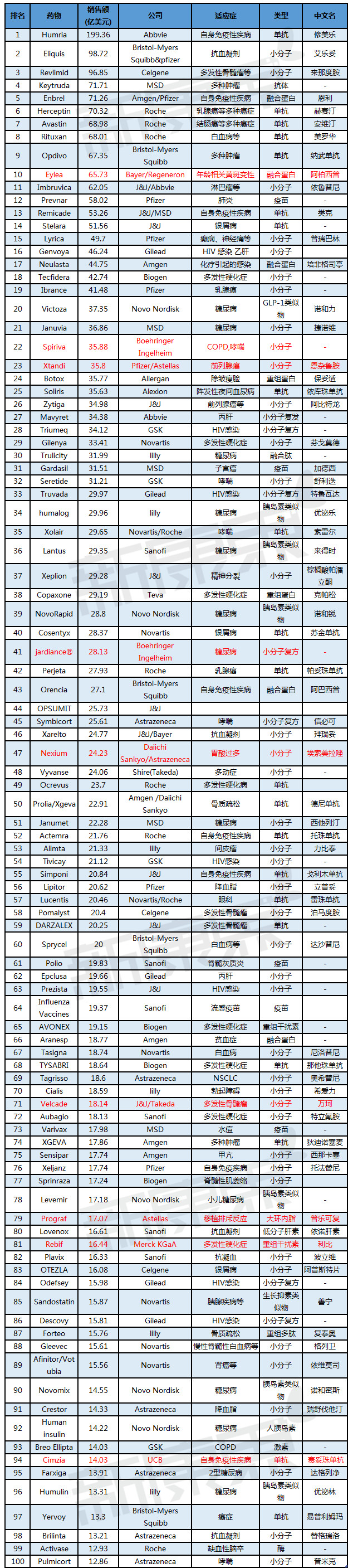 From this, it can be seen that TOP1 continues to lead strongly thanks to its broad indications, followed closely by the chemical small-molecule drugs apixaban and lenalidomide. In particular, apixaban and rivaroxaban have risen rapidly due to their excellent efficacy. The gap between positions 4 and 9 is very small, where five of the world's best-selling anti-cancer drugs are clustered: the PD-1 monoclonal antibody duo Keytruda and Opdivo, along with Roche's three giants, showing a trend of new and old alternating. Anti-tumor drugs still occupy a significant share, with both biologics and chemical drugs ranking at the forefront. In the diabetes small-molecule field, sitagliptin takes the lead, while empagliflozin begins to exert its power. In the hepatitis C field, due to the outstanding therapeutic effects of combination drugs like sofosbuvir, the number of hepatitis C patients has plummeted, and sales of hepatitis C curative drugs are accelerating downward. Although biologics remain a hot spot, small-molecule chemical drugs also have potential. We look forward to more sofosbuvirs and apixabans breaking through the encirclement of biologics and entering the TOP10.